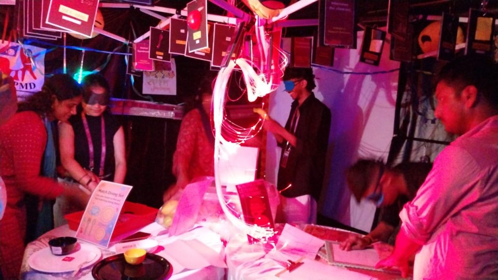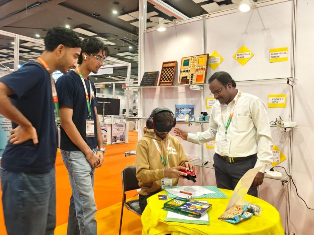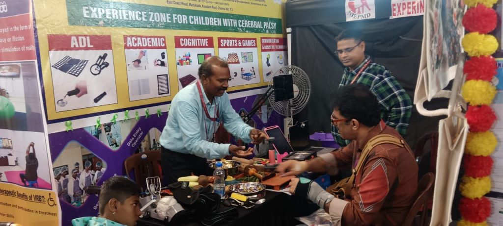 Dr.K.K, Dhanavendan, Special Teacher (CP) explaining the Assistive Devices of CP in CP experience Zone